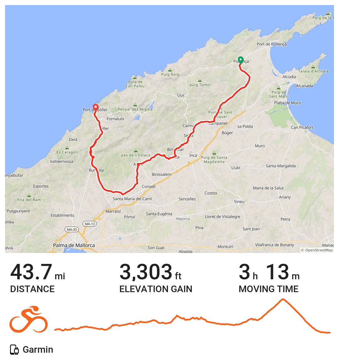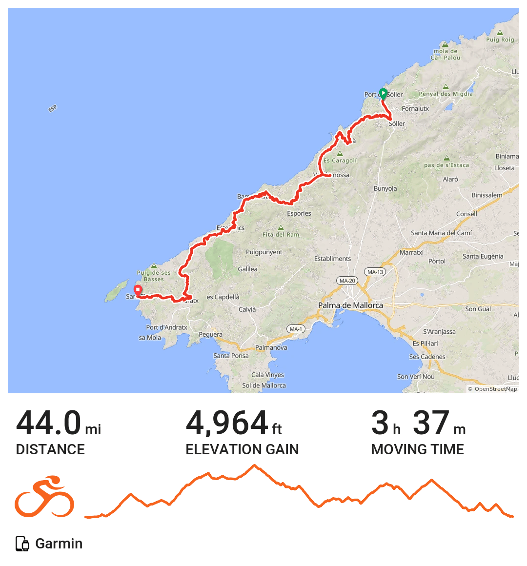 Our longest and most spectacular ride: 44 miles and 5,000 feet of climbing along the coastline through Deià and Valldemossa, where Alfonso joined us again for the journey to Sant Elm. We were lucky enough to run into our Colorado friends Jeff and Anna. Jeff provided a good draft, setting us up for the second half of the ride.