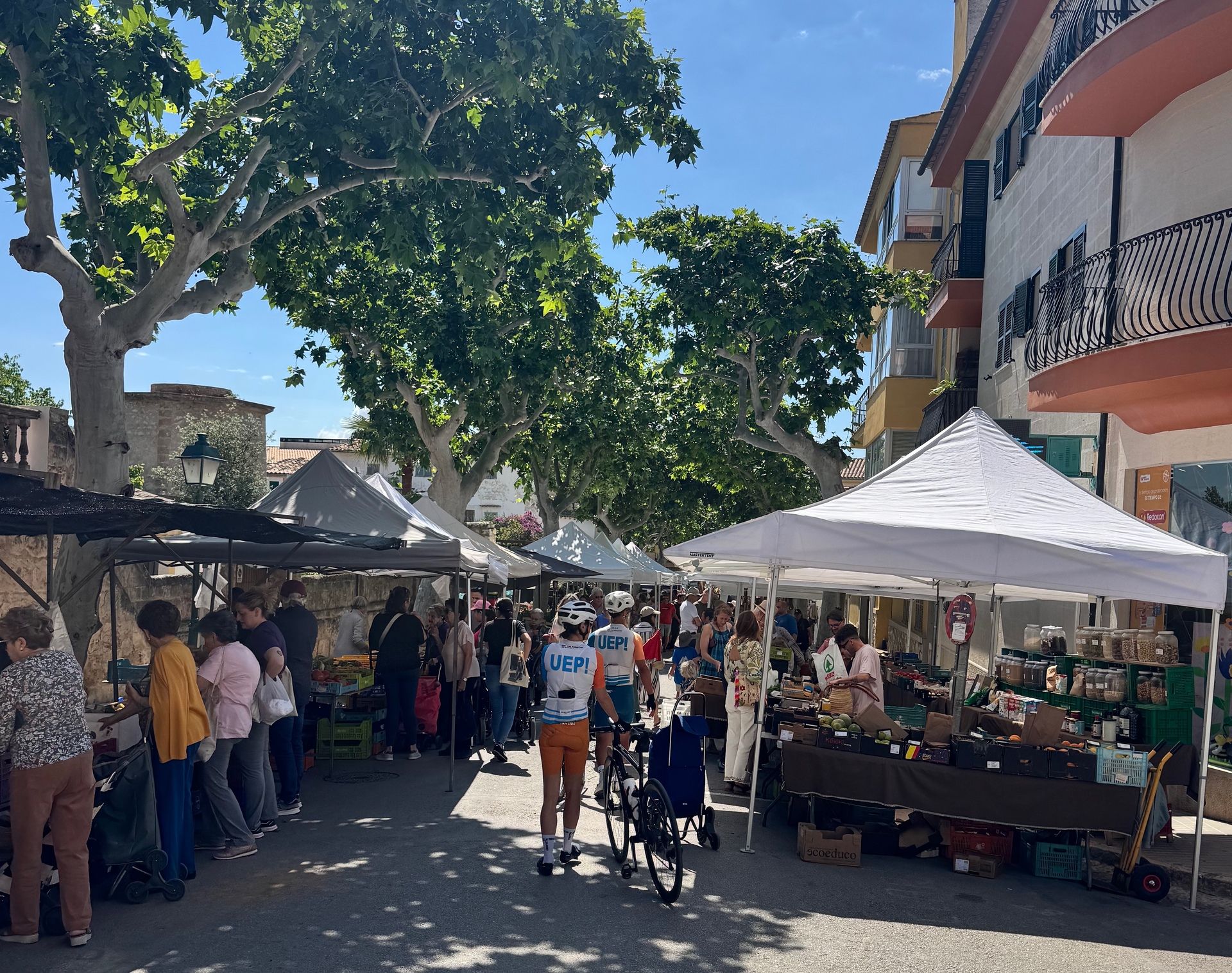 Saying goodbye to Can Auli was bittersweet, but Alfonso's offer to ride with us on his day off made the transfer to Port de Sóller unforgettable. Twenty-two miles of easy back-road riding south of Serra de Tramuntana brought us to Alaró, Alfonso's hometown, just as Saturday market day filled the main street with fresh coffee, pastries, produce, jewelry, and local life.