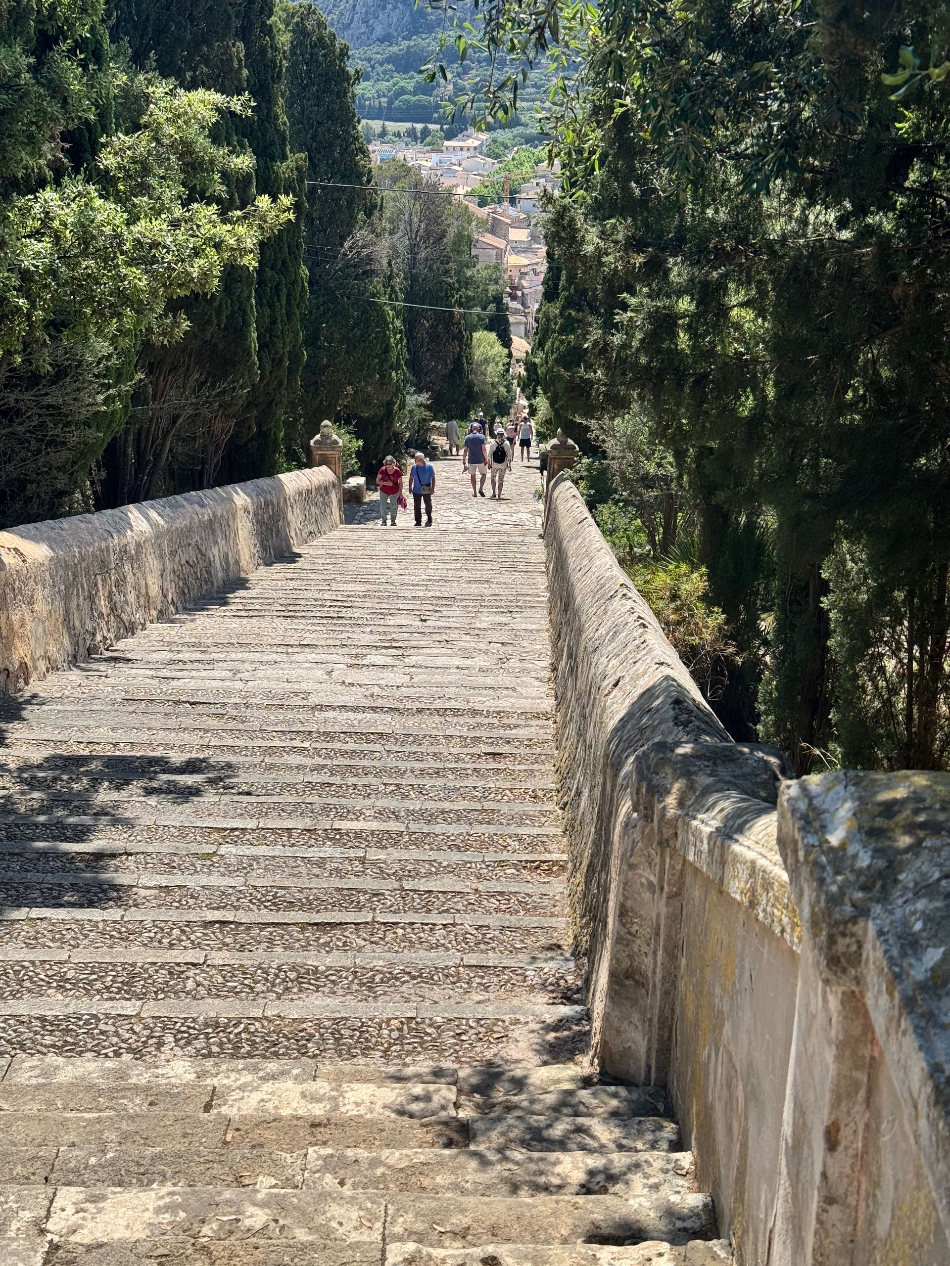 We took today off from cycling for laundry, reading, and exploring Pollença on foot. Our "rest" included hiking the steep cobblestoned path to Santuari de la Mare de Déu del Puig for spectacular views, then walking into town to climb the famous Calvari Steps—all 365 of them.